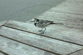 で、この鳥はパン屑狙い。慣れたもので人がテーブルに着くとさ~っと近くに舞い降りてきます。足下をちょろちょろしながらあっちのパン屑をつつき、ベンチに上がってそっちのパン屑をついばみ、仕舞いにはテーブルの上に乗ってパン屑が出るのを待っているという……。