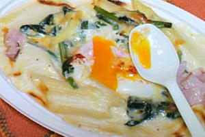 先日わたしが食べなかった半熟卵とほうれん草のグラタンですよ。そっか、温めてもぜんっぜんOKなのね。